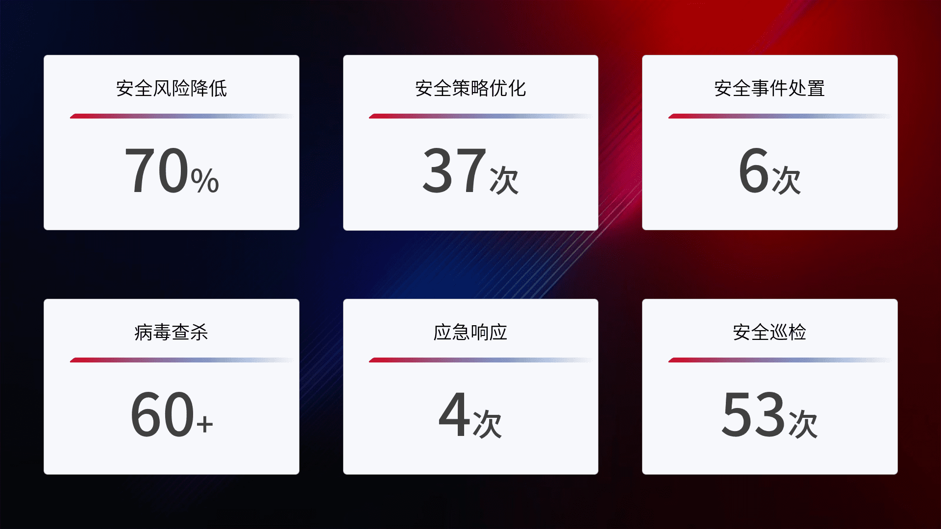 提供全面的安全事件报告体系,,包括处置报告、、、周报、、季度和年度总结,,,结合持续监控,,,帮助客户深入了解网络安全状况。。