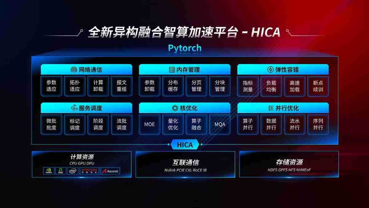 通过自研的服务层、、、中间适配层、、、以及调度编排算法,,,,采用数据并行、、、模型并行等多种并行方式,,,把并行计算任务进行有效的分解,,,使其分别由相应的软件栈和算力资源来承接。。。当GPU资源变化,,,HICA可以实时动态调度计算子任务并调整模型拓扑和架构,,,以充分聚合各种算力资源。。。。